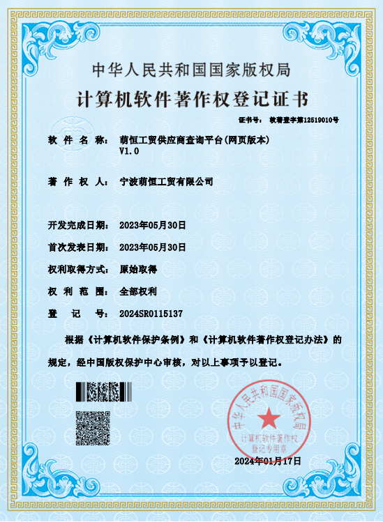 近(jìn)日(rì),萌恒工(gōng)貿供應商查詢平$≤台(網頁版本)獲得(de)了(le)由國(guó)家(¥jiā)版權局簽發的(de)計(jì)算(suàn)機(jī)軟件♦≈✔≠(jiàn)著作(zuò)權登記證書(shū)。即萌恒享有(yǒu)該軟件(jiàn)的(de<π↔)發表權、署名權、複制(zhì)權、發行(xíng)權、出租權 ₽、信息網絡傳播權、翻譯權以及應當由著作(zuò)權人(rén)享有(yǒu)的(de÷×)其他(tā)權利。這(zhè)既是(shì)軟件(jiàn)權利歸屬的(de)有(yǒu)力 σ證明(míng),也(yě)是(shì)企業(yè)自(zì)主研發能(nén★™g)力的(de)客觀憑證。