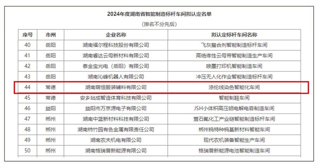 湖(hú)南(nán)萌恒滌綸線廠(chǎng)獲評2024年(nián)度湖(hú)南(ná©$">n)省智能(néng)制(zhì)造标杆車(chē)間(jiān)